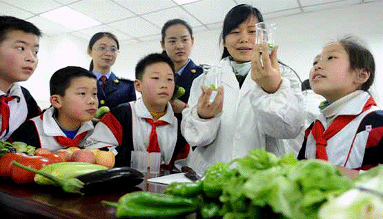 3月14日,安徽省合肥市包河区屯溪小学阳光校区的学生走进包河区食物平安检测室,和工做人员一路脱手对蔬菜样本进行食物平安检测。通过领会食物平安检测法式,孩子们对食物平安的主要性有了更深切的认识。摄影/刘军喜。